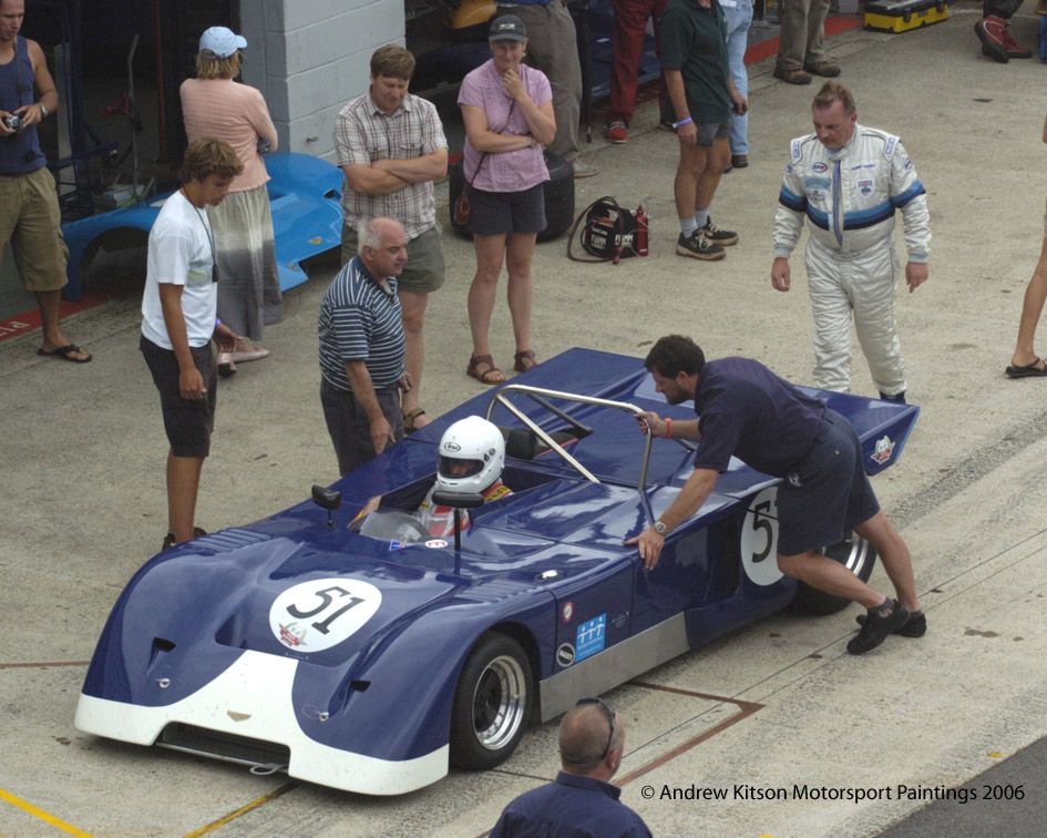 | Tim Cousins and Marcus Pye testing a new FVC head at the Silverstone Classic 2006 (© Andrew Kitson Motorsport Paintings 2006)